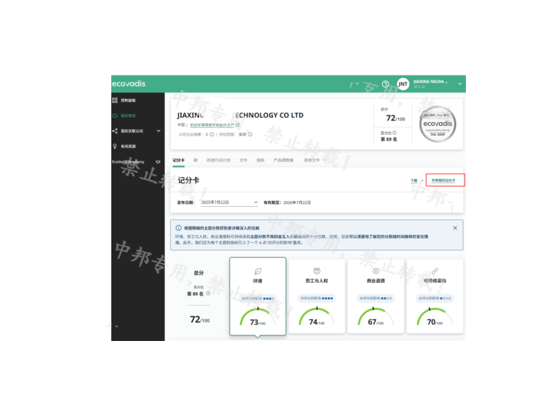 恭贺嘉兴市XX科技有限公司2025年7月EcoVadis取得72分的优秀成绩