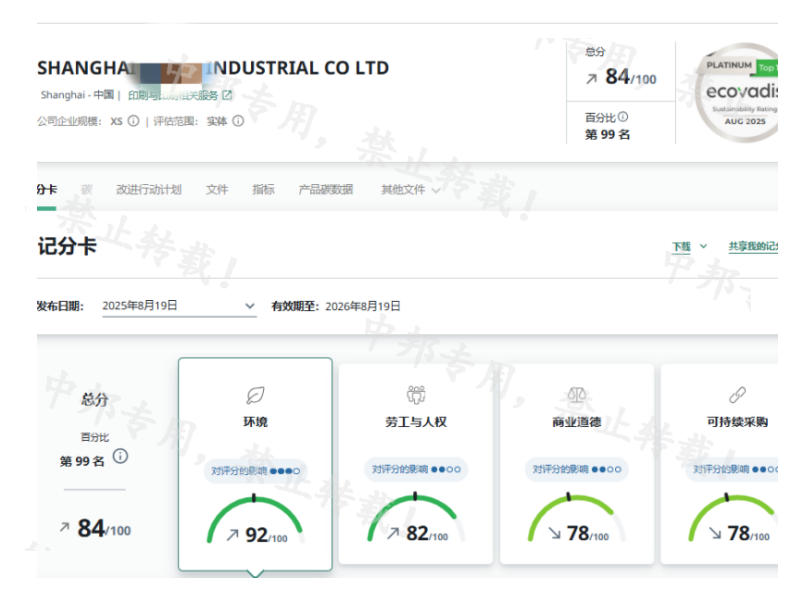 恭贺上海XX实业有限公司2025年8月EcoVadis取得84分的优秀成绩